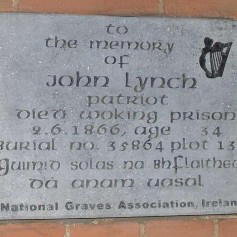 Lynch was sent first to Pentonville Prison. Later in December 1865, due to a chest infection, he was moved to the hospital in Woking Prison. Other inmates at Woking included Jeremiah O’Donovan Rossa, Captain Richard O’Sullivan Burke (retired from the US army), Captain Timothy Deasy (of the 9th Massachusetts Infantry Volunteers), Brian Dillon (a law clerk from Cork), and Charles Kickham (author of the popular novel Knocknagow).